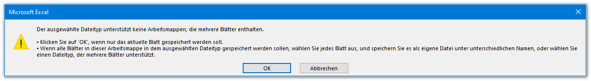 In ggf. angezeigten Meldung Der ausgewählte Dateityp unterstützt keine Arbeitsmappen, die mehrere Blätter enthalten auf OK klicken.