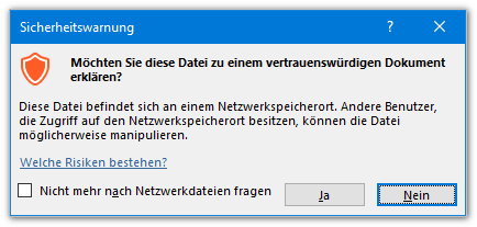 Diese Sicherheitswarnung wird nur beim erstmalige Öffnen einer in Teams gespeicherten Datei angezeigt. Nach dem Klicken auf Ja unterbleibt die Warnung, wenn die Datei später erneut geöffnet wird, da sie nun als vertrauenswürdig eingestuft ist.