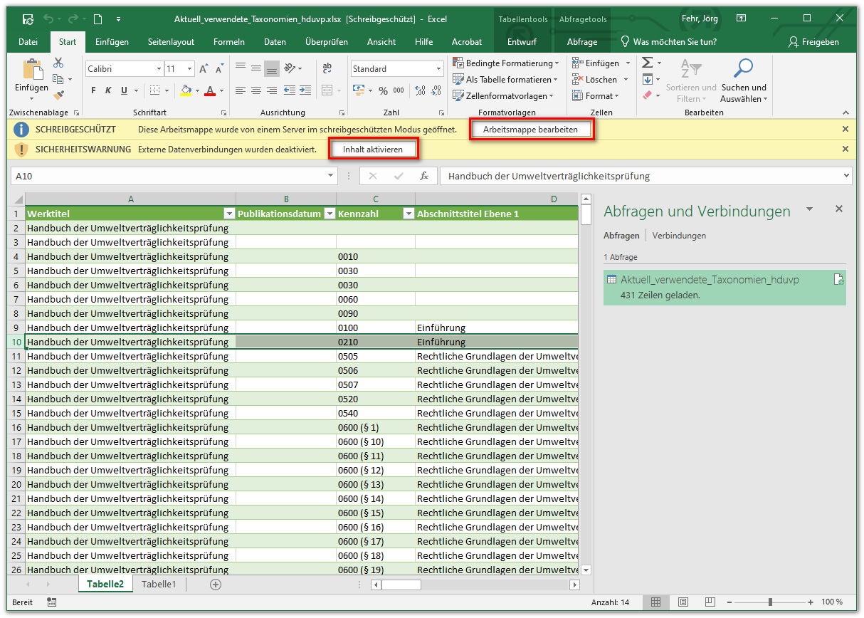 Die Excel-Datei wird schreibgeschützt geöffnet.