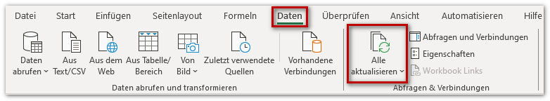 9. Im Menüband von Microsoft Excel auf die Registerkarte Daten und dort in der Menübandgruppe Abfragen und Verbindungen auf Alle aktualisieren klicken.